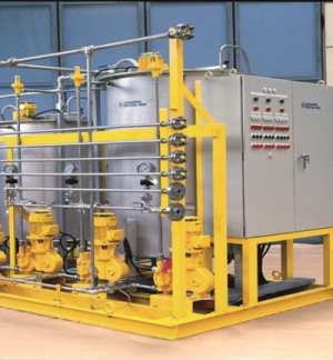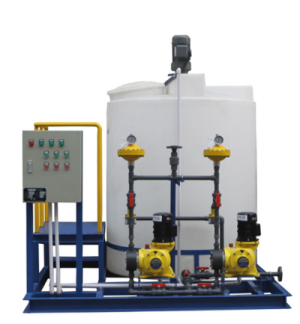 循環(huán)冷卻水加藥系統(tǒng),根據(jù)循環(huán)冷卻水的濃縮倍數(shù),通過電導(dǎo)率儀檢測(cè)循環(huán)冷卻的電導(dǎo)率(指標(biāo)為水的含鹽量)達(dá)到一定數(shù)值后,控制電磁閥打開,循環(huán)冷卻水系統(tǒng)開始排放污水,在排放污水的同時(shí)向水中補(bǔ)加新鮮的水,同時(shí)向水中投加緩蝕阻垢劑(其投加濃度根據(jù)水質(zhì)和緩蝕阻垢劑的種類)。由于循環(huán)冷卻水的堿度偏高,可以通過自動(dòng)加酸裝置調(diào)節(jié)其PH值。通過向水中比例投加殺菌滅藻劑,控制循環(huán)冷卻水的細(xì)菌和粘泥的增長(zhǎng)。